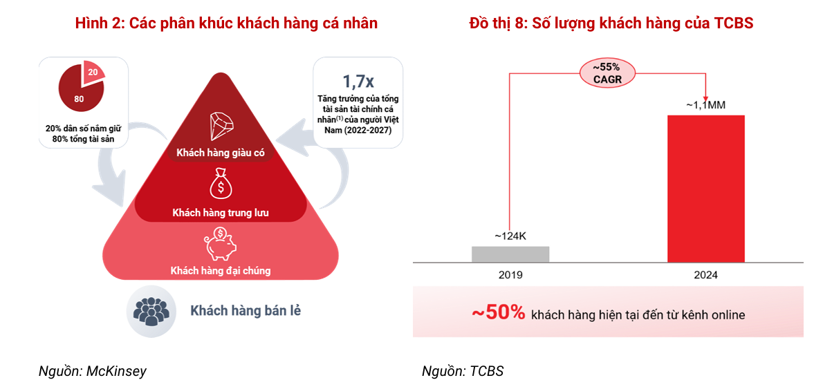 Tỷ lệ khách hàng mở tài khoản online đạt gần 99%, cho thấy năng lực tiếp cận thị trường đại chúng với chi phí thấp. Tính đến ngày 31/3/2025, tổng số tài khoản tại TCBS đã vượt mốc 1.1 triệu.