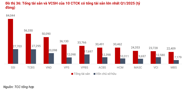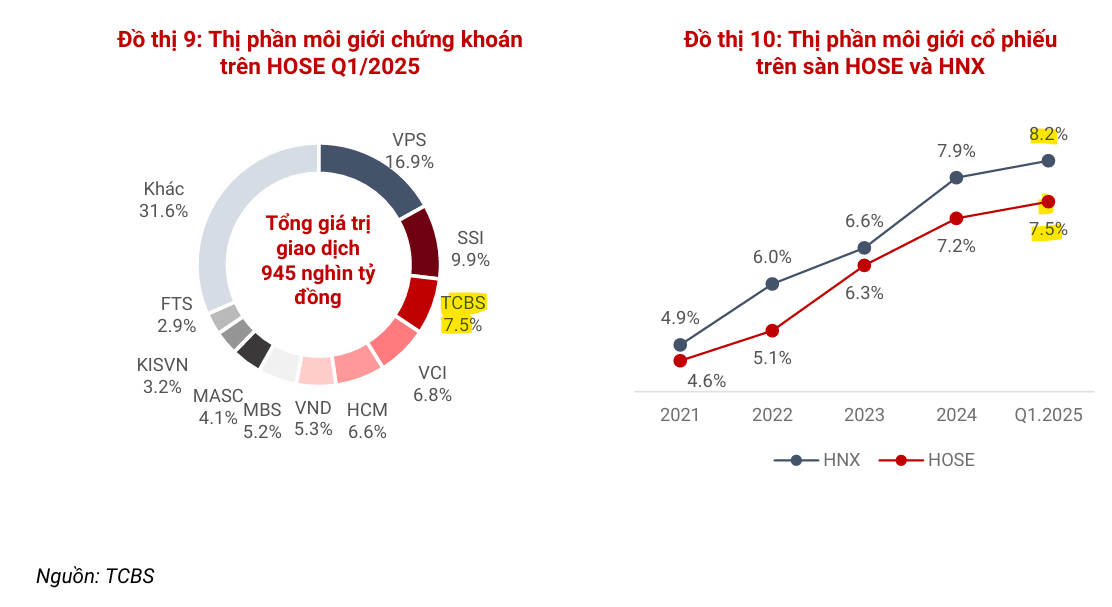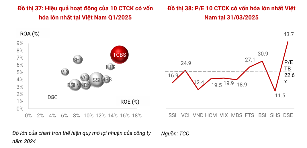 Đến quý 1/2025, tỷ suất lợi nhuận trên vốn chủ sở hữu (ROE) của TCBS đạt 15% và lợi nhuận trên tổng tài sản (ROA) đạt 8%, cao hơn nhiều so với trung bình Top 10 công ty chứng khoán có vốn hóa lớn nhất tại 31/03/2025 là 9.6% và 4.4%.