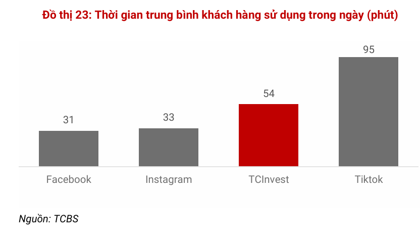 Khả năng sử dụng công nghệ để tiếp cận khách hàng đang được những con số chứng minh là đúng. Với thời gian sử dụng trung bình lên tới 54 phút/ngày, TCInvest vượt xa các nền tảng tiêu dùng phổ biến như Facebook (31 phút) hay Instagram (33 phút), và chỉ xếp sau TikTok (95 phút) (Đồ thị 23). Mặc dù các nền tảng này thuộc lĩnh vực giải trí và có đặc tính lan truyền mạnh mẽ, mức độ giữ chân người dùng của TCInvest – một nền tảng đầu tư – là điều hiếm thấy, kể cả trên bình diện quốc tế.