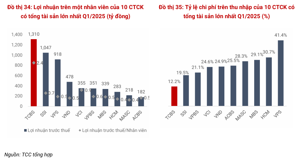 Tỷ lệ chi phí/doanh thu (CIR) của TCBS thường xuyên nằm trong nhóm thấp nhất thị trường, phản ánh năng lực kiểm soát chi phí vượt trội.