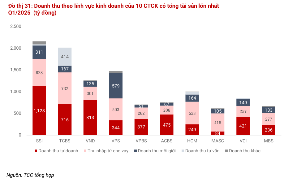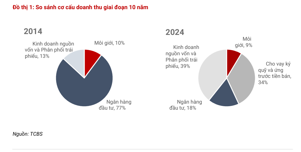 Ngược lại, tại 2024, các dịch vụ liên quan đến chứng khoán, kinh doanh nguồn vốn và phân phối trái phiếu hiện đóng góp hơn 80% tổng doanh thu, phản ánh sự thay đổi trong chiến lược kinh doanh sang mô hình