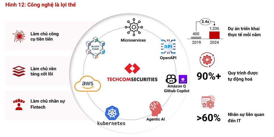 Không giống phần lớn các công ty chứng khoán nội địa phụ thuộc vào đội ngũ môi giới truyền thống, TCBS phát triển dựa trên hệ thống công nghệ lõi tự xây dựng và năng lực tài chính vững mạnh từ ngân hàng mẹ Techcombank. Điều này tạo nên một hệ sinh thái đầu tư khép kín, có khả năng mở rộng quy mô linh hoạt và tối ưu hóa chi phí vận hành.