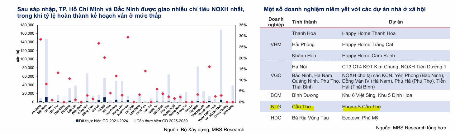 Bên cạnh đó, yêu cầu cụ thể hơn về chỉ tiêu nhà ở xã hội (theo Quyết định 444/QĐ-TTg của Thủ tướng Chính phủ) cũng tạo áp lực đẩy nhanh tiến độ các dự án nhà ở xã hội từ nay đến năm 2030, giải quyết sự mất cân bằng cung cầu và mang lại cơ hội cho các doanh nghiệp có kinh nghiệm trong phân khúc này như VHM, VGC, BCM, NLG, HDC.