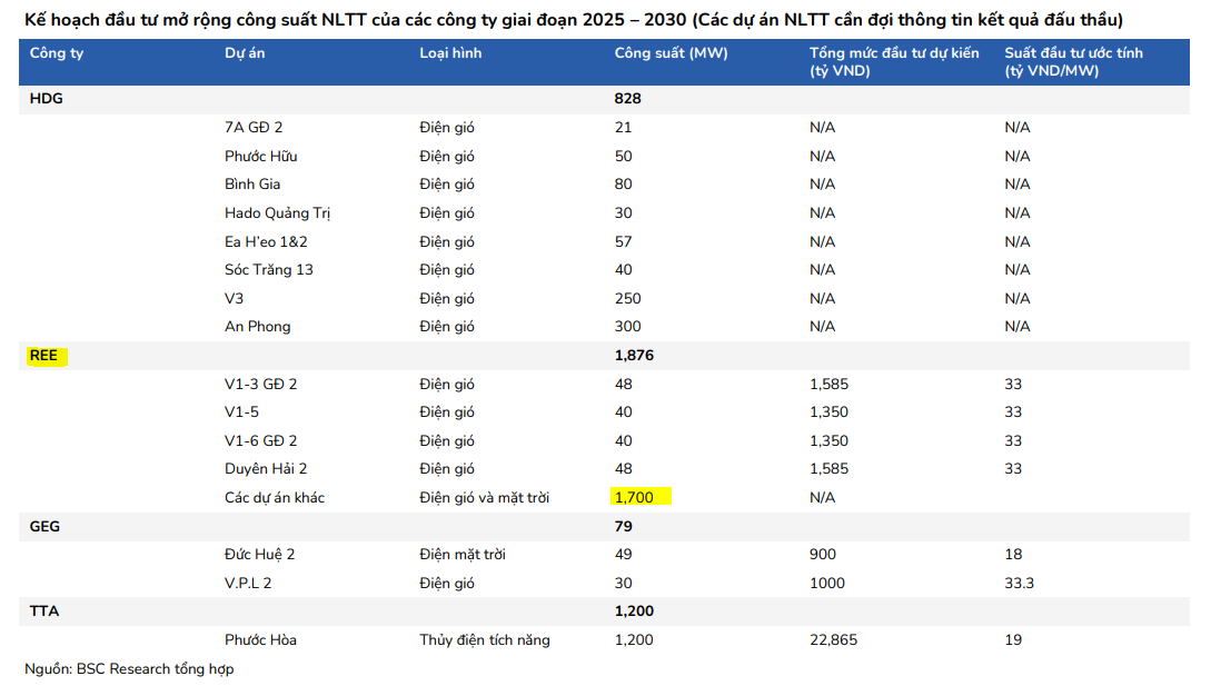 - Doanh nghiệp tiềm năng: REE được đánh giá có tiềm năng nhất trong mở rộng công suất nhờ khả năng huy động vốn chi phí thấp và tìm kiếm đối tác cung cấp vật tư giá thấp. BSC nhấn mạnh cần chờ kết quả đấu thầu giá điện.