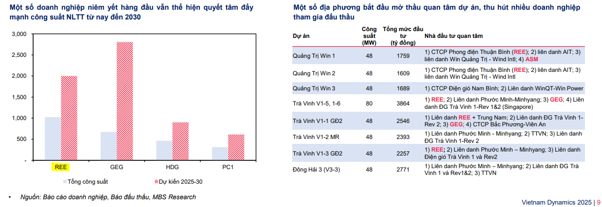 - Doanh nghiệp hưởng lợi cụ thể: HDG, GEG, REE, PC1 được kỳ vọng hưởng lợi từ 2025 nhờ kinh nghiệm và tham vọng mở rộng công suất.