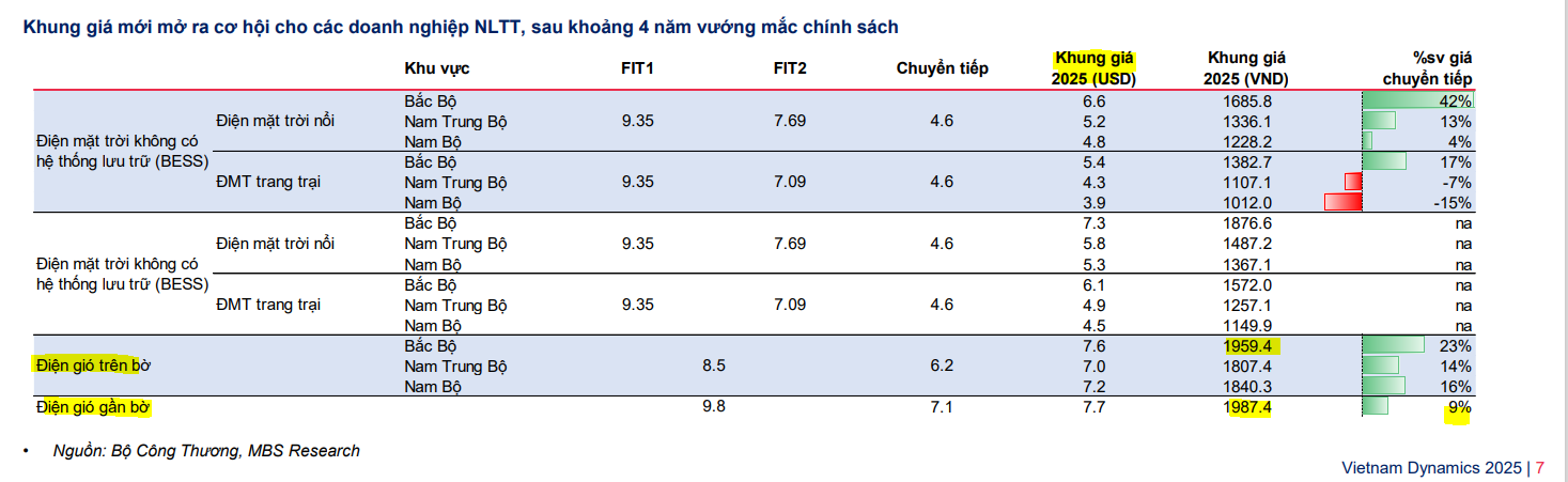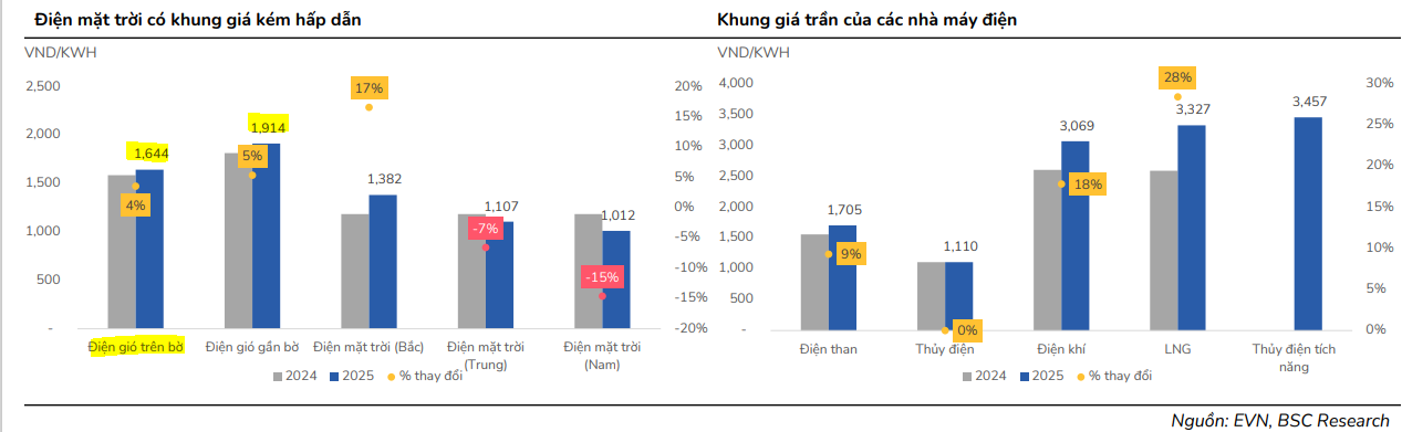 - Điện gió: Khung giá mới được đánh giá đủ hấp dẫn (điện gió trên bờ cao hơn 14-23% so với khung chuyển tiếp, điện gió gần bờ cao hơn 9%).