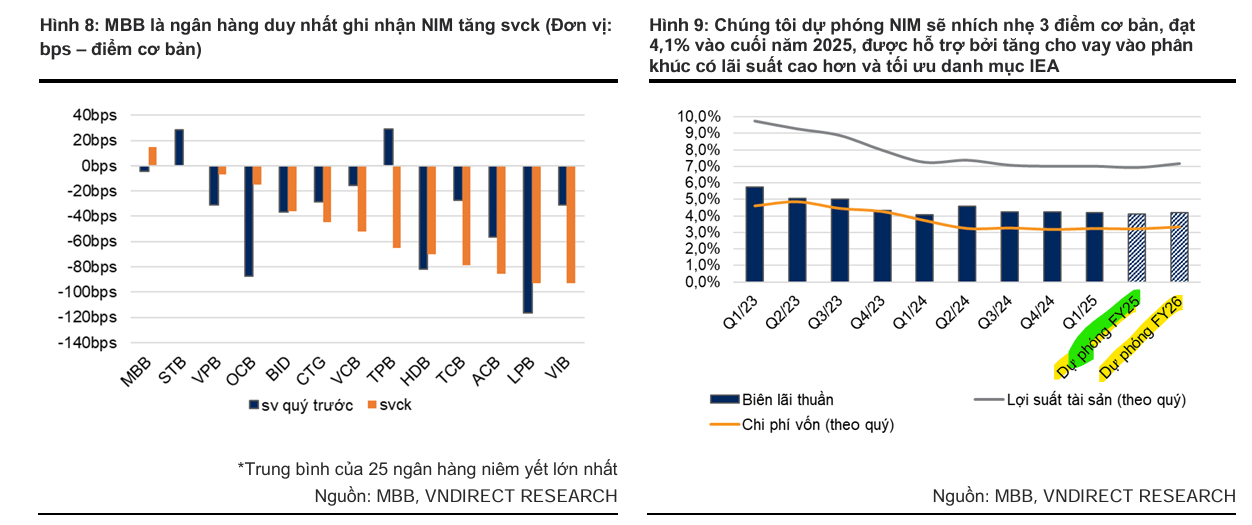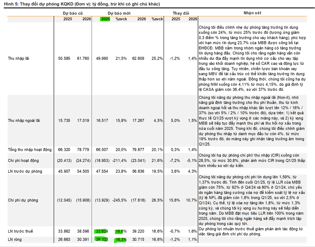 - Tăng trưởng tín dụng tích cực: Dự phóng tăng trưởng tín dụng MBB đạt 24% trong năm 2025, được dẫn dắt bởi đầu tư công tăng mạnh (thúc đẩy nhu cầu vay xây dựng, bất động sản) và tín dụng bán lẻ phục hồi (nhờ nhà ở xã hội, lãi suất thấp, thị trường BĐS ấm lên, lợi thế CASA cao).