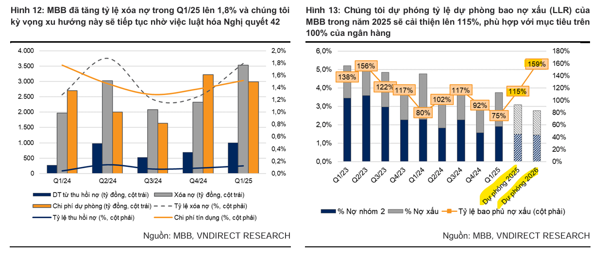 - Chất lượng tài sản cải thiện: Mặc dù áp lực từ nợ nhóm 2 tăng và rủi ro sau khi Thông tư 02 hết hiệu lực, tỷ lệ nợ xấu dự phóng ở mức 1.59% nhờ chính sách hỗ trợ của Chính phủ cho lĩnh vực bất động sản và năng lượng, cùng tốc độ tăng trưởng kinh tế cao. VNDirect cũng nhấn mạnh việc MBB đang tích cực hỗ trợ tái cơ cấu nợ của các doanh nghiệp như Novaland và Trung Nam.