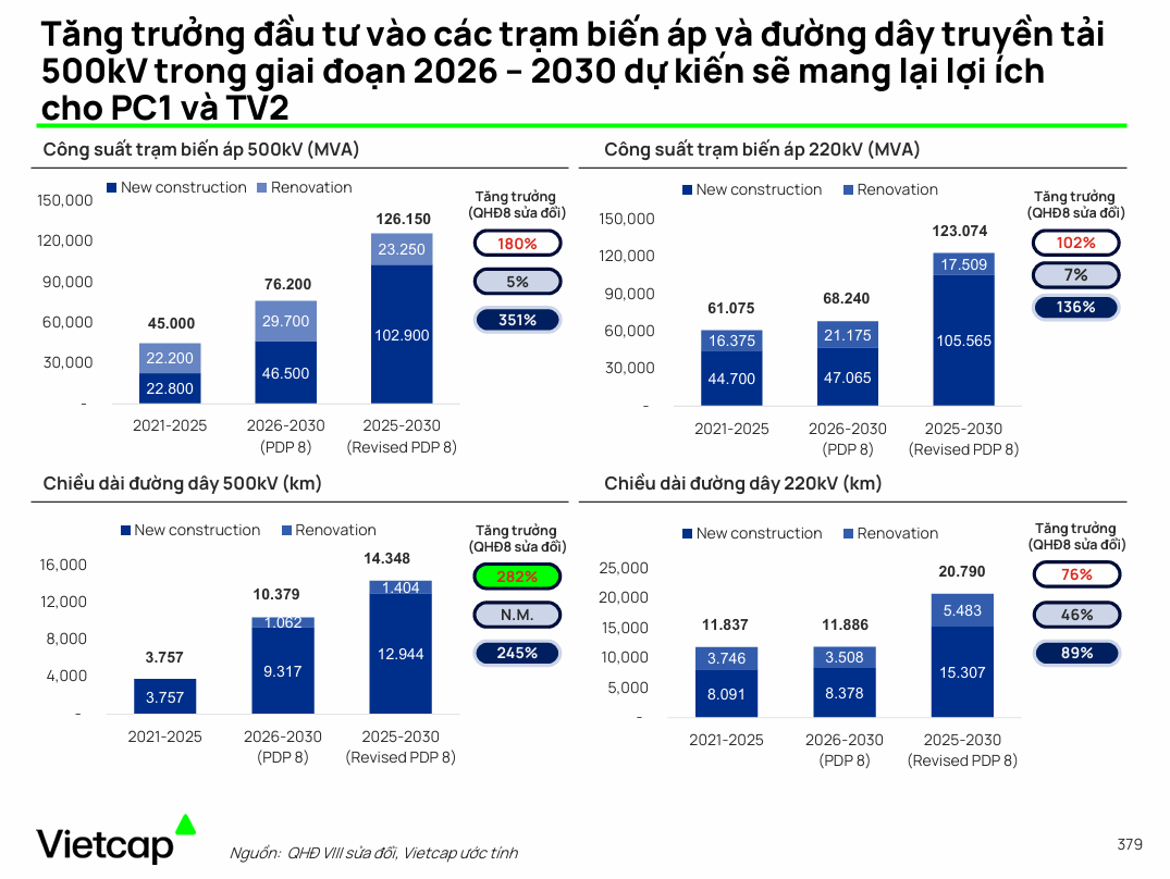 VDSC nhận định rằng mục tiêu đặt ra trong QHD8DC tạo ra khối lượng công việc lớn cho các nhà thầu có kinh nghiệm trong xây dựng điện. Hai doanh nghiệp niêm yết nhiều khả năng được hưởng lợi trực tiếp là PC1 (Tập đoàn PC1) và TV2 (Công ty Cổ phần Tư vấn Xây dựng Điện 2).