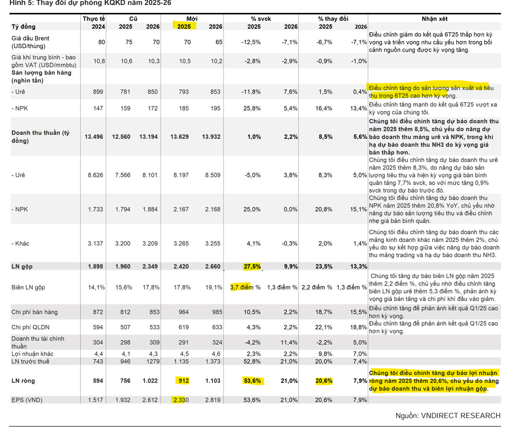 Cụ thể, LNST sau lợi ích CĐTS năm 2025 dự kiến tăng 69% YoY, đạt 907 tỷ đồng. Mức tăng lợi nhuận này chủ yếu từ mảng urê (tổng LNST urê cao hơn 13% nhờ giá bán urê trung bình cao hơn 7,8% bù đắp cho giá khí trung bình cao hơn 1,0%), bù đắp cho dự báo tổng LNST NPK thấp hơn 21%.