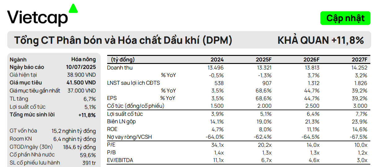 Vietcap (10.7.2025) nâng giá mục tiêu cho DPM thêm 12.2% lên 41,500 đồng/cổ phiếu và duy trì khuyến nghị KHẢ QUAN. Mức tăng giá mục tiêu này chủ yếu được thúc đẩy bởi dự báo tổng lợi nhuận sau thuế (LNST) sau lợi ích cổ đông thiểu số (CĐTS) giai đoạn 2025-2029 cao hơn 9.5%.