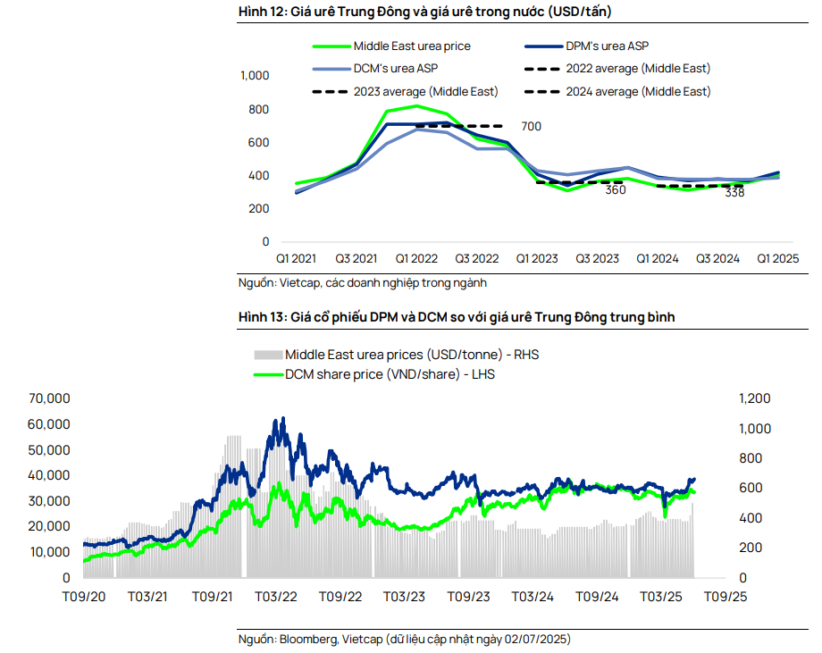 Ngắn hạn (2025): Vietcap nâng dự báo giá urê Trung Đông năm 2025 thêm 5% lên 395 USD/tấn (+17% YoY), do giá trong nửa đầu năm cao hơn kỳ vọng (402 USD/tấn). Điều này được thúc đẩy bởi nguồn cung từ Iran/Ai Cập/EU thắt chặt (thiếu khí, giá khí tăng), nhu cầu cao từ Ấn Độ và căng thẳng địa chính trị Trung Đông.