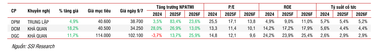 SSI kỳ vọng DPM sẽ ghi nhận mức tăng trưởng lợi nhuận cao từ nửa cuối năm 2025, với LNTT của DPM dự kiến đạt 602 tỷ đồng (+562% YoY) trong khi DCM dự kiến đạt 862 tỷ đồng (+91% svck). Đà tăng trưởng lợi nhuận có khả năng kéo dài sang năm 2026, nhờ áp dụng chính sách thuế GTGT mới cho nguyên năm. Tuy nhiên, tăng trưởng lợi nhuận trong năm 2026 chậm lại so với mức tăng mạnh trong 2025, do không còn hiệu ứng nền so sánh thấp từ năm trước.