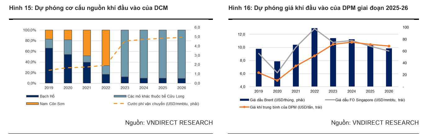 - Giá khí đầu vào hạ nhiệt: VNDirect hạ dự báo giá dầu Brent trong 2025/2026 xuống lần lượt 70/65 USD/thùng. Theo đó, giá khí đầu vào của DPM dự phóng giảm 3.1%/2.4% YoY, xuống còn 10.5/10.2 USD/thùng trong năm 2025/2026.