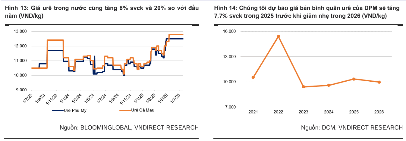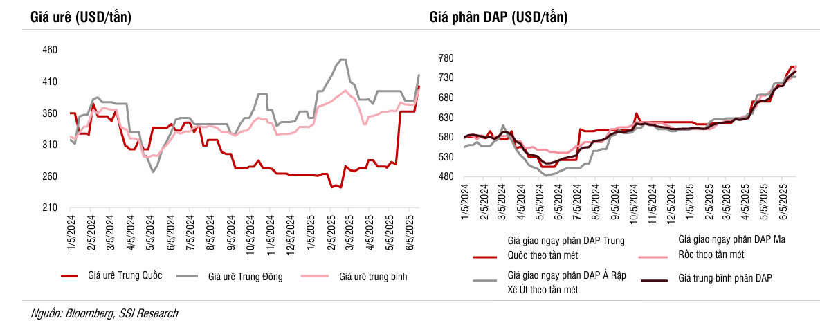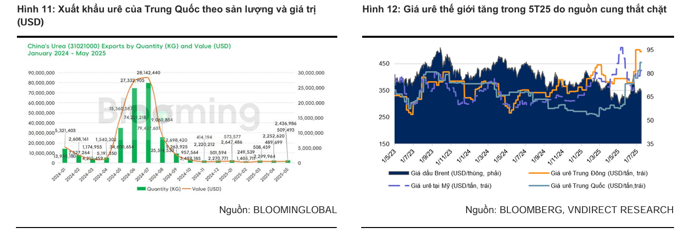 - Xu hướng giá phân bón: Giá urê tại châu Âu đã tăng 16% YoY trong 5 tháng đầu năm 2025. SSI dự báo giá bán urê sẽ tăng 10% YoY trong năm 2025 và ổn định trong năm 2026. Mặc dù Trung Quốc có thể nối lại xuất khẩu urê và DAP, tác động đến giá toàn cầu được dự báo không đáng kể do chênh lệch giá nội địa và quốc tế đã thu hẹp.
