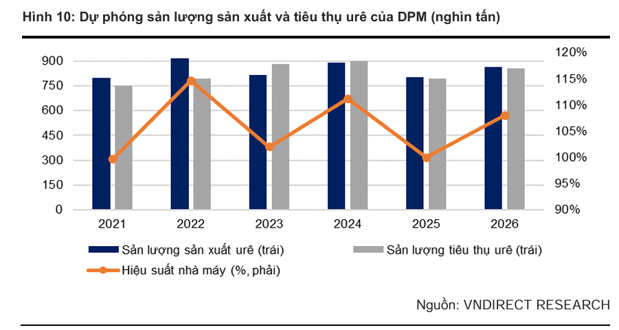 VNDirect dự phóng lợi nhuận ròng của DPM năm 2025 tăng mạnh 69.6% YoY, đạt 911.9 tỷ đồng, chủ yếu nhờ biên lợi nhuận gộp urê được cải thiện mạnh. Sang năm 2026, lợi nhuận ròng được kỳ vọng tiếp tục tăng 21% YoY, lên 1,103 tỷ đồng, nhờ giá dầu tiếp tục giảm và sản lượng tiêu thụ urê kỳ vọng phục hồi.