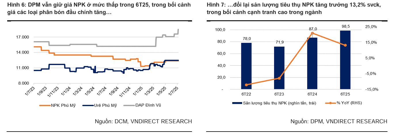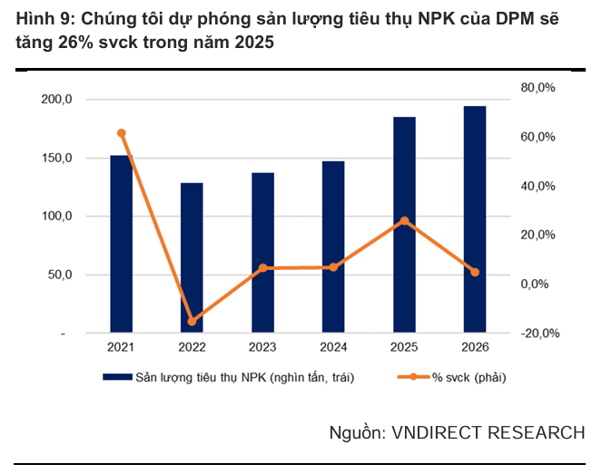 - Mảng NPK tăng trưởng mạnh: Sản lượng tiêu thụ NPK của DPM trong 6 tháng đầu năm 2025 tăng 13.2% YoY, đạt 98,500 tấn. VNDirect kỳ vọng DPM sẽ duy trì chiến lược mở rộng thị phần, đặc biệt khi môi trường cạnh tranh được cải thiện nhờ siết chặt kiểm soát hàng giả, hàng kém chất lượng. Dự báo sản lượng tiêu thụ NPK năm 2025 tăng 26% YoY lên 185,000 tấn, và tiếp tục tăng 5% YoY năm 2026.