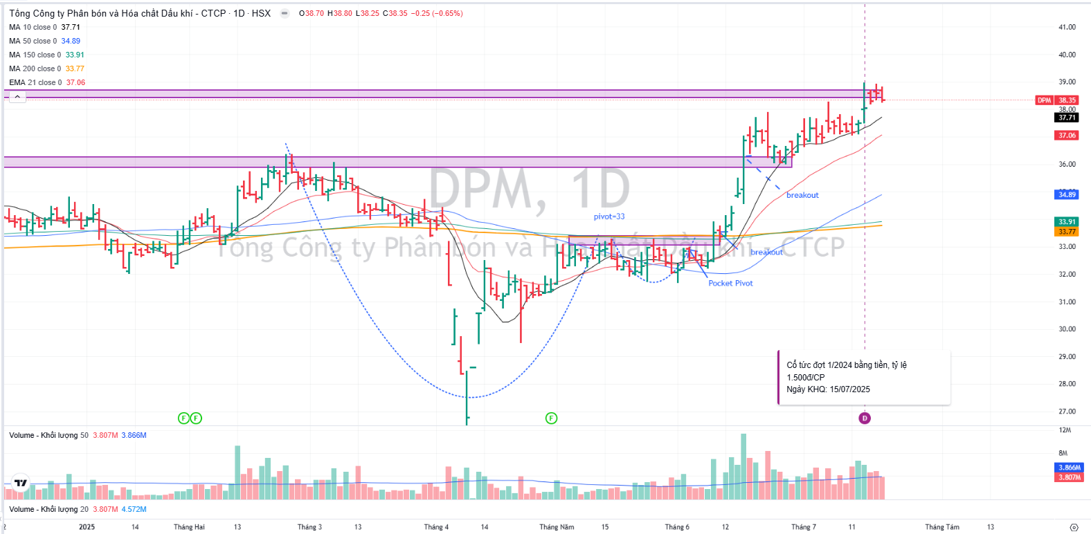- Tài chính và cổ tức: DPM có nền tảng tài chính vững chắc với lượng tiền mặt ròng 7,400 tỷ đồng và tỷ lệ tiền mặt ròng/vốn chủ sở hữu là 65% (cuối Q1/2025), giúp duy trì chính sách cổ tức tiền mặt ổn định (2,000 đồng/cp năm 2025, 3,000 đồng/cp năm 2027).
