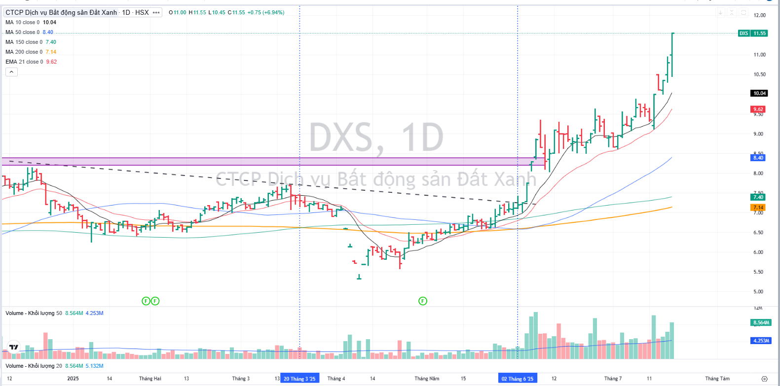 Tuy nhiên, DXS đã tăng giá hơn 40% kể từ điểm breakout vùng tích luỹ ngày 6.6.2025. Vì điểm breakout diễn ra khi thị giá còn dưới mệnh nên không được đếm nền giá.