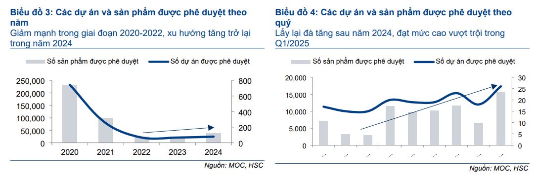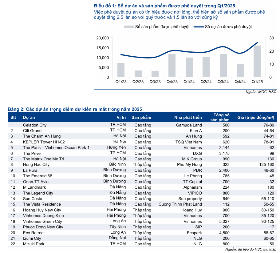 HSC kỳ vọng nguồn cung sẽ tăng mạnh trong thời gian tới, đặc biệt tại TP.HCM, nơi có sự cải thiện đáng kể về mức độ sẵn sàng phê duyệt các dự án BĐS. Nhiều dự án quy mô lớn đã được mở bán trong Quý 2/2025, sau nhiều năm thị trường miền Nam đối mặt với tình trạng thiếu hụt nguồn cung, bao gồm Vinhomes Green City (Long An), Vinhomes Long Beach (Cần Giờ) và Eco Retreat (Long An), cùng với các dự án bổ sung từ DXG (căn hộ cao tầng) và KDH (căn hộ thấp tầng).