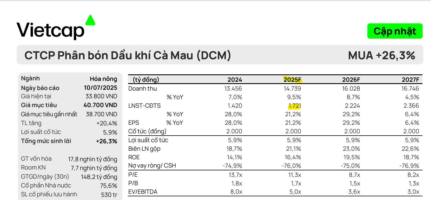 Vietcap (10.7,2025) điều chỉnh tăng 5.2% giá mục tiêu lên 40,700 đồng/cổ phiếu và giữ nguyên khuyến nghị MUA đối với DCM. Mức tăng giá mục tiêu này chủ yếu được thúc đẩy bởi việc điều chỉnh tăng 3.6% dự báo lợi nhuận sau thuế (LNST) sau lợi ích cổ đông thiểu số (CĐTS) giai đoạn 2025-2029.