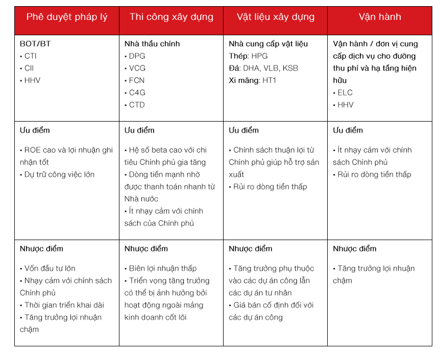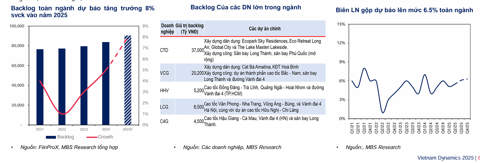 - Ngành xây dựng hạ tầng hưởng lợi: MBS đánh giá các doanh nghiệp xây lắp sẽ được hưởng lợi nhờ đã có kinh nghiệm tại các dự án lớn, nền tảng tài chính lành mạnh và đáp ứng đúng tiến độ. Các doanh nghiệp đầu ngành như CTD, VCG, LCG, FCN có thể hưởng lợi nhờ đấu thầu các dự án mới. Backlog của các doanh nghiệp xây lắp dự kiến tăng trưởng 8% so với cùng kỳ.