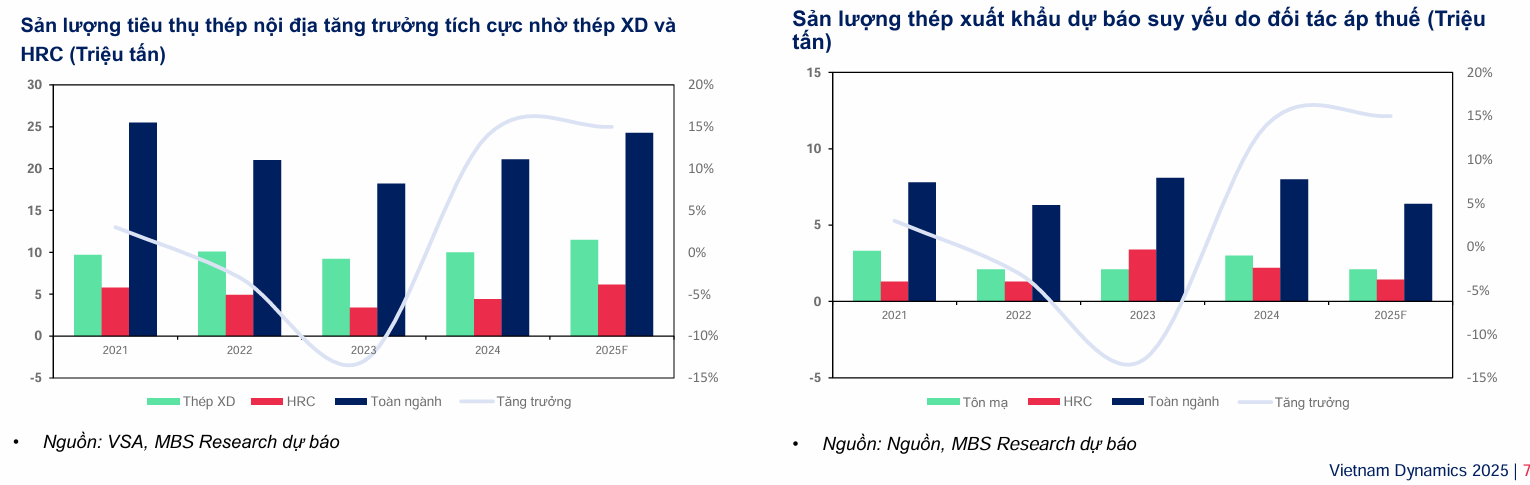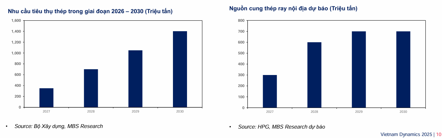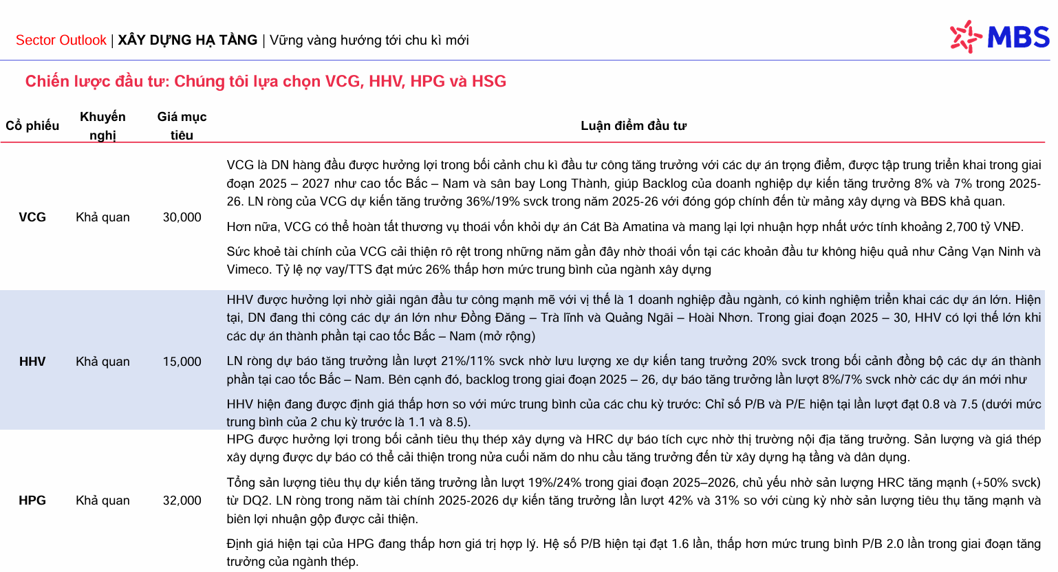 Lựa chọn đầu tư: MBS lựa chọn VCG, HHV, HPG và HSG. VCG được đánh giá là doanh nghiệp hàng đầu hưởng lợi từ chu kỳ đầu tư công, với backlog dự kiến tăng trưởng 8%/7% trong 2025-2026 và LN ròng tăng trưởng 36%/19%. HHV hưởng lợi nhờ giải ngân đầu tư công mạnh mẽ và định giá thấp. HPG hưởng lợi từ tiêu thụ thép xây dựng và HRC tích cực nhờ nhu cầu tăng trưởng từ hạ tầng và dân dụng.