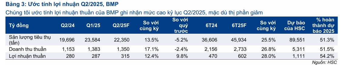 Mặc dù thị phần của BMP giảm xuống 22.1% (so với 27.6% trong Q1/2025 và 23.0% năm 2024) do tốc độ tăng trưởng sản lượng thấp hơn NTP, BMP vẫn ghi nhận lợi nhuận thuần ước đạt 315 tỷ đồng (+12% YoY, +10% QoQ).