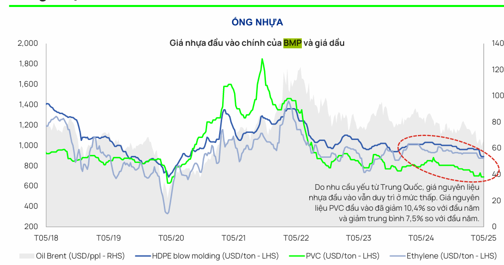 - Lợi nhuận kỷ lục này được thúc đẩy bởi chi phí đầu vào duy trì ở mức thấp (giá hạt nhựa PVC bình quân Q2/2025 khoảng 700 USD/tấn, giảm 14% YoY, 9% QoQ) và chương trình khuyến mãi từ giữa tháng 6.