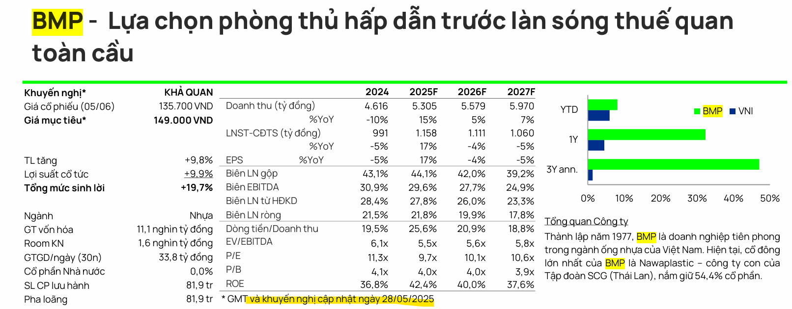 Vietcap (4.7.2025) duy trì khuyến nghị KHẢ QUAN và giá mục tiêu 149,000 VND cho BMP, đánh giá đây là một lựa chọn phòng thủ tốt trong bối cảnh bất ổn.