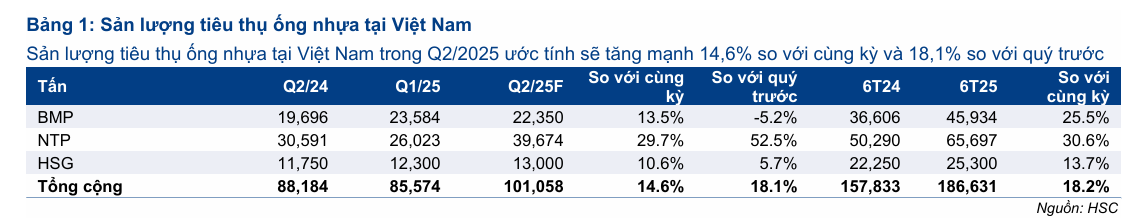 - Sản lượng tiêu thụ ống nhựa toàn ngành tăng mạnh 14.6% YoY và 18.1% QoQ, đạt 101,058 tấn, nhờ hoạt động xây dựng sôi động (đầu tư công và BĐS phục hồi).