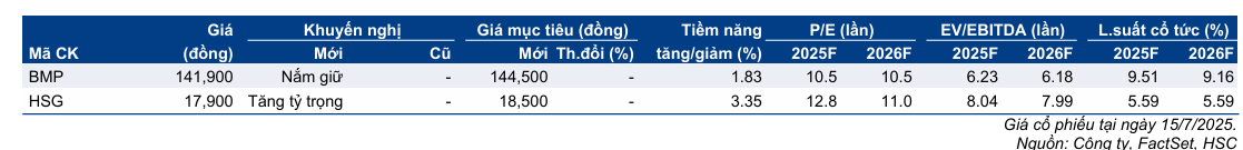 HSC (19.7.2025) duy trì khuyến nghị Nắm giữ và giá mục tiêu 144,500đ đối với BMP.