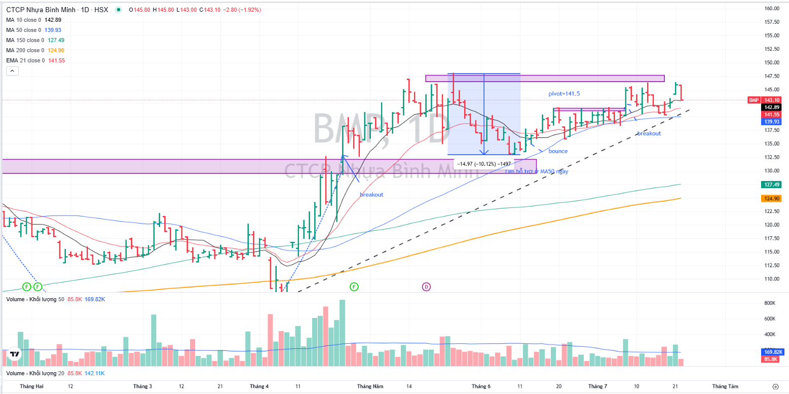 BMP đang gặp cản kháng cự ở vùng giá 146,000, gần với mục tiêu giá của các CTCK. Do đó, cổ phiếu cần phải tốn thời gian siết lại nền giá quanh MA50 ngày. Các nhà giao dịch chờ đợi điểm mua thích hợp khi nền giá hình thành xong.