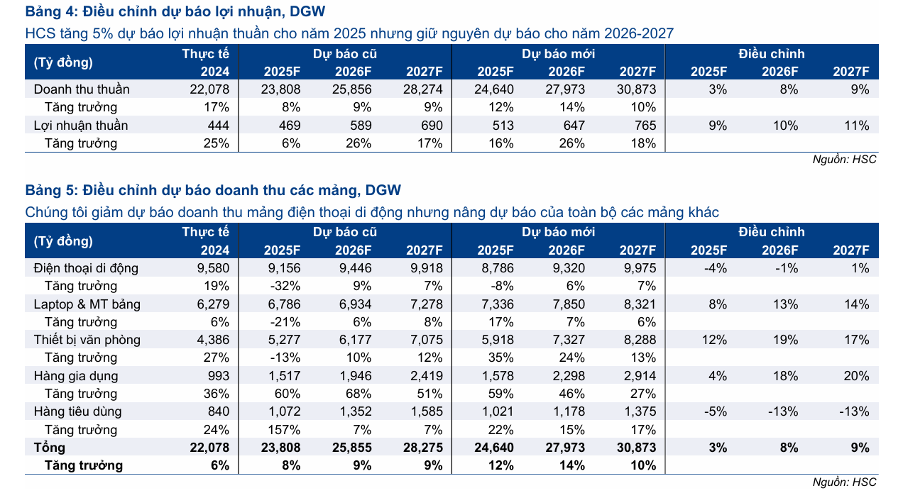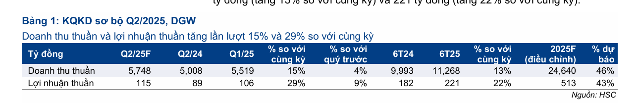 SSI dự phóng tăng trưởng NPATMI (Lợi nhuận sau thuế và lợi ích cổ đông thiểu số) của DGW là 25% trong năm 2025 và 17% trong năm 2026.