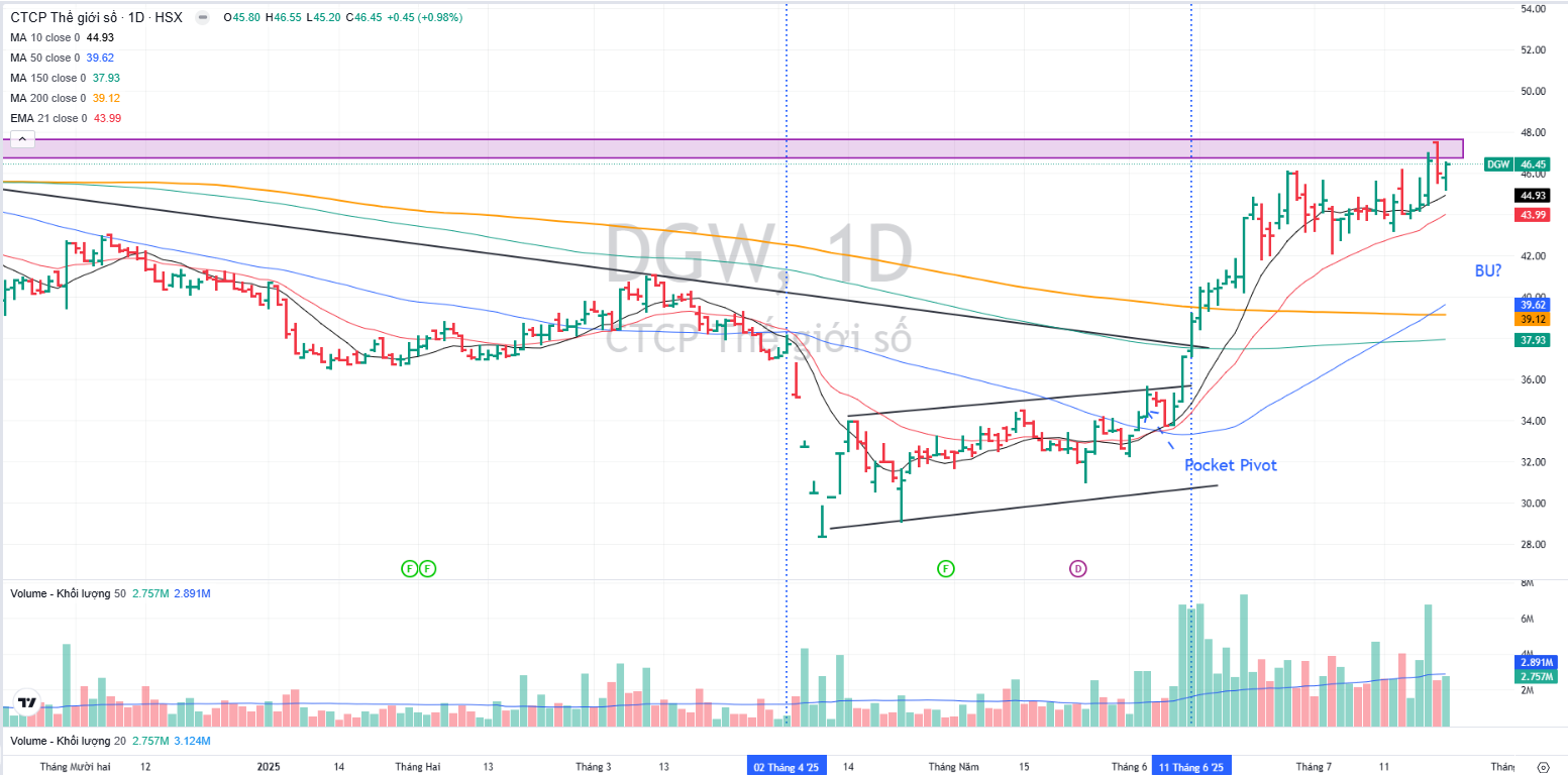 Sau cú tăng giá mạnh gần 65% kể từ đáy tháng 4 và trở lại vùng đỉnh tháng 9.2024, DGW cần có thêm thời gian để tích luỹ trở lại nền giá.