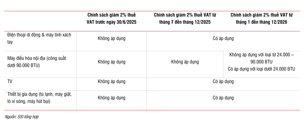 • Gia hạn giảm 2% VAT: Chính phủ phê duyệt gia hạn chính sách giảm 2% thuế VAT đến hết năm 2026, mở rộng phạm vi áp dụng cho nhiều mặt hàng điện tử tiêu dùng (điện thoại, TV, điều hòa dưới 24,000 BTU, thiết bị gia dụng).