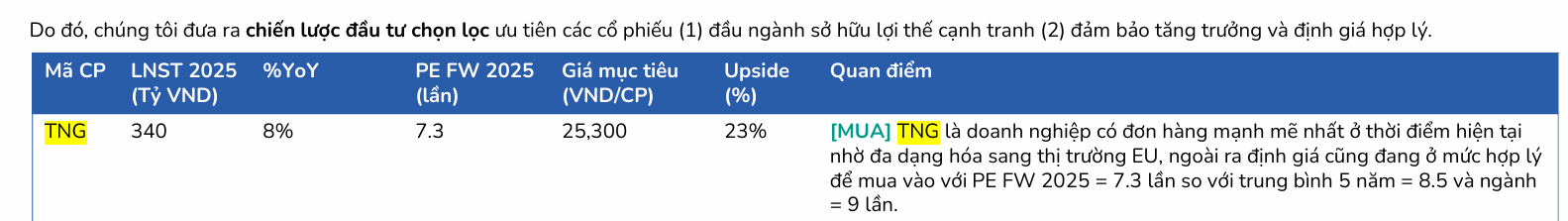 - MAS có vẻ thận trọng hơn một chút khi hạ khuyến nghị xuống “Tăng tỷ trọng” do giá cổ phiếu đã tăng mạnh, đồng thời dự báo nhu cầu thị trường Mỹ giảm trong nửa cuối năm. Tuy nhiên, MAS vẫn đánh giá cao lợi thế từ chính sách thuế quan đối ứng và sự ổn định mà TNG được hưởng.