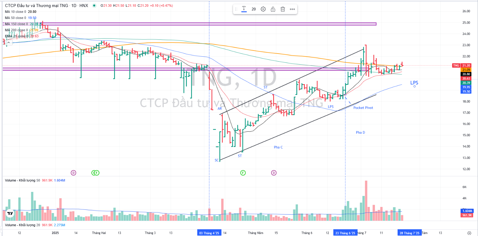 TNG đang gặp phải sự kháng cự bởi MA200 ngày và cần thời gian tích luỹ ở đây. Khả năng cổ phiếu cần tích luỹ lại quanh cả MA50 ngày để xây nền giá sau khoảng thời gian tăng giá mạnh từ đáy tháng 4.