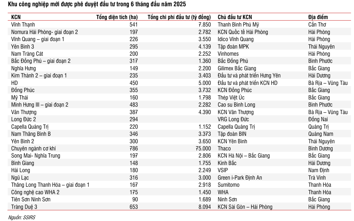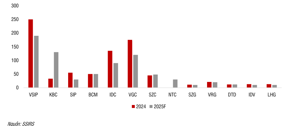 HSC dự báo diện tích cho thuê đất chưa ghi nhận doanh thu và hoạt động bàn giao đất của các nhà phát triển BĐS KCN sẽ phục hồi trong nửa cuối năm 2025 từ mức nền thấp của Quý 2/2025.