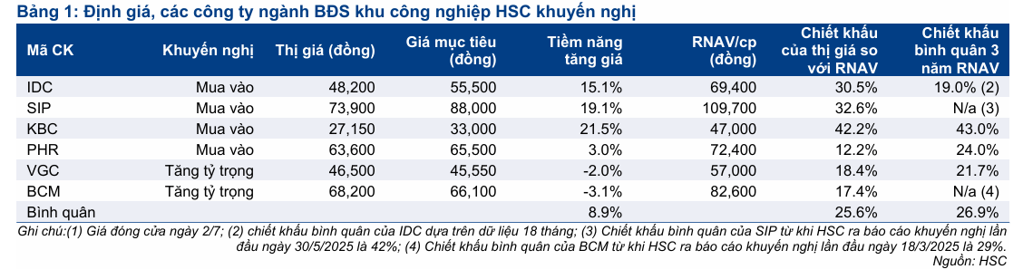 - SIP và IDC: Có quỹ đất lớn ở miền Nam, bảng cân đối kế toán lành mạnh, và khách hàng ít bị ảnh hưởng bởi rủi ro thuế quan. IDC có lợi suất cổ tức hấp dẫn (7.3%), SIP (3,3%).