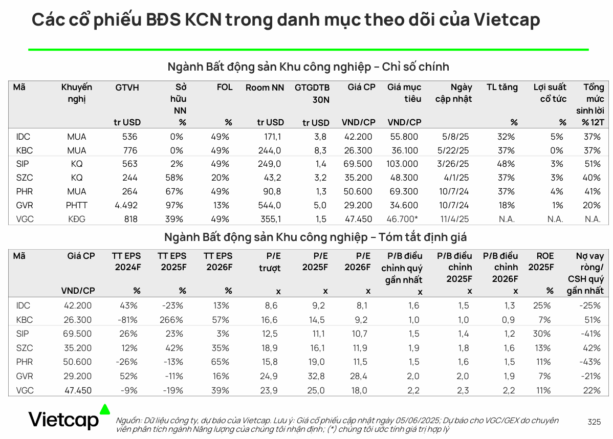 - Cả IDC và KBC đều được giao dịch với định giá hấp dẫn (P/B điều chỉnh dự phóng 2025 của IDC là 1.5 lần, KBC là 1.0 lần).