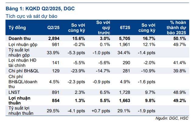 HSC (23.7.2025) duy trì khuyến nghị MUA đối với DGC và giữ nguyên giá mục tiêu 128,000đ (tiềm năng tăng giá 26%) sau khi KQKD Quý 2/2025 sát với dự báo.