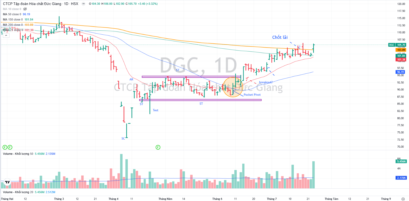 DGC chỉ mới tăng 10%-12% kể từ điểm breakout nền giá nhưng Elibook Team khuyến nghị chốt lãi sau khi giá chạm vào MA200 ngày.