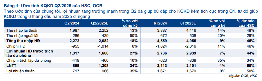 Dựa trên xu hướng và triển vọng hiện tại, HSC ước tính LNST của OCB sẽ tăng mạnh 34% so với cùng kỳ trong Quý 2/2025, đạt 966 tỷ.