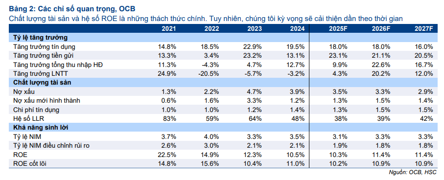 HSC giữ nguyên quan điểm và dự báo cho giai đoạn 2025-2027 đối với OCB, dù lưu ý các khó khăn chính về chất lượng tài sản và tỷ suất lợi nhuận vẫn tiếp diễn.