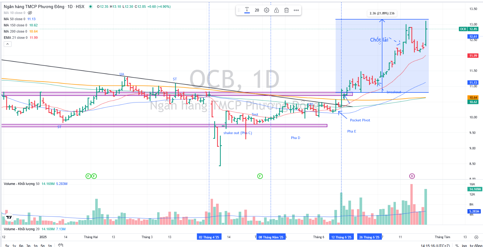 OCB đã tăng 20% từ điểm breakout đường trendline và đây là thời điểm chốt lãi. Elibook Team đã khuyến nghị khoá lãi vào ngày 14.7.2025