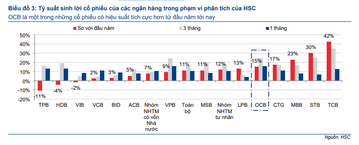 Giá cổ phiếu OCB đã tăng 16% trong 1 tháng qua và tăng 21% kể từ báo cáo doanh nghiệp của HSC vào cuối tháng 5/2025. Mức tăng này vượt trội so với bình quân nhóm NHTM tư nhân, có thể nhờ định giá hấp dẫn, thông báo cổ tức tiền mặt và một số yếu tố tích cực về chất lượng tài sản.