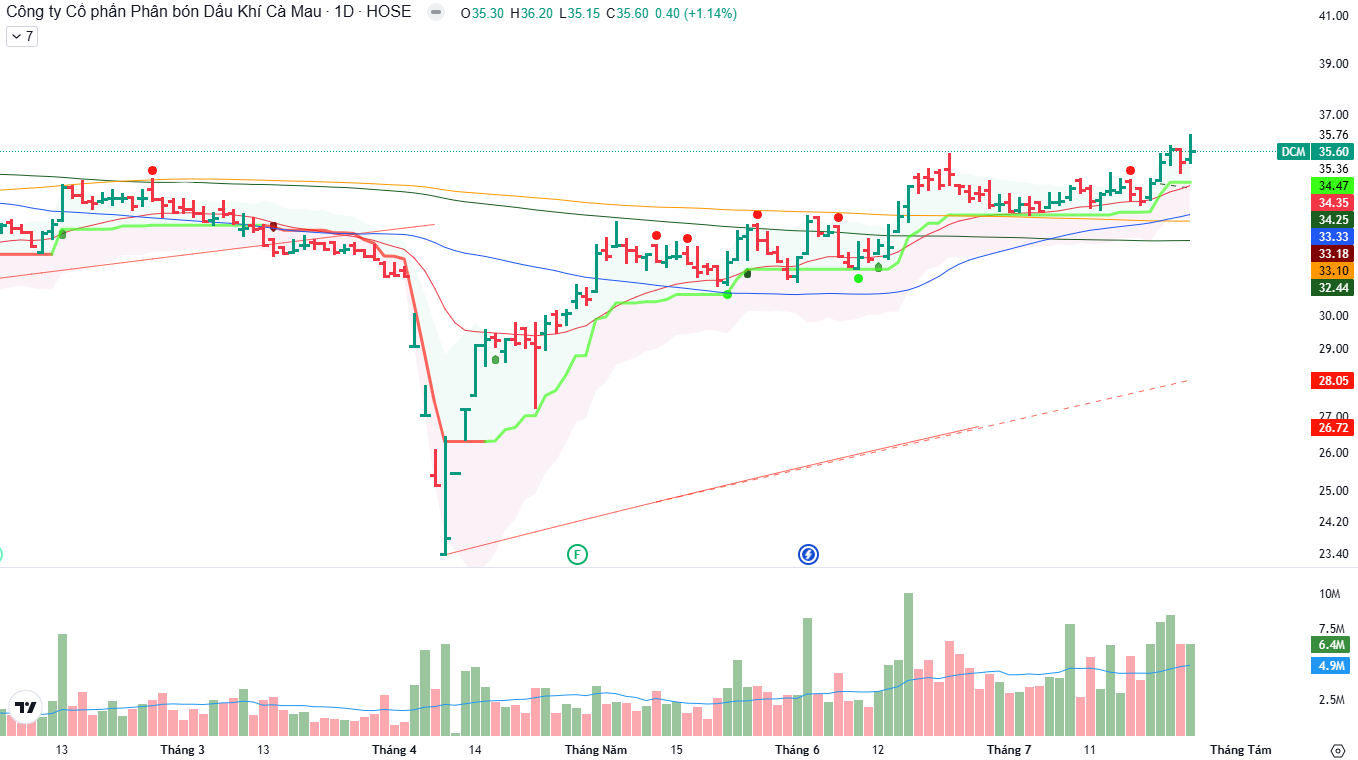 Trong ngắn hạn, cổ phiếu DCM có thể gặp khó khi thị trường đang chờ thêm chất xúc tác ngành (ví dụ sóng phân bón). Về mặt kỹ thuật, vùng giá hiện tại cũng đang gặp kháng cự mạnh từng hình thành trong 2022 và 2024.
