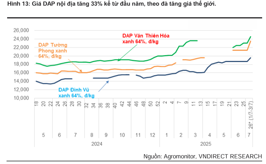 Tận dụng nguồn lực sản xuất phân bón để hưởng lợi từ giá tăng: Giá phân bón toàn cầu đã tăng mạnh trong năm 2025 sau khi Trung Quốc hạn chế xuất khẩu phân bón, thúc đẩy giá bán DAP/MAP trong nước đã tăng 33% kể từ đầu năm. VNDirect dự báo doanh thu từ phân bón sẽ tăng 22.5%/8.3% so với cùng kỳ trong năm 2025/2026, đóng góp tích cực vào tăng trưởng doanh thu của DGC. Luật thuế GTGT sửa đổi, có hiệu lực từ ngày 1/7/2025, chuyển phân bón sang chịu thuế suất 5%, cho phép DGC được khấu trừ thuế đầu vào, giúp giảm chi phí sản xuất và củng cố lợi thế cạnh tranh.