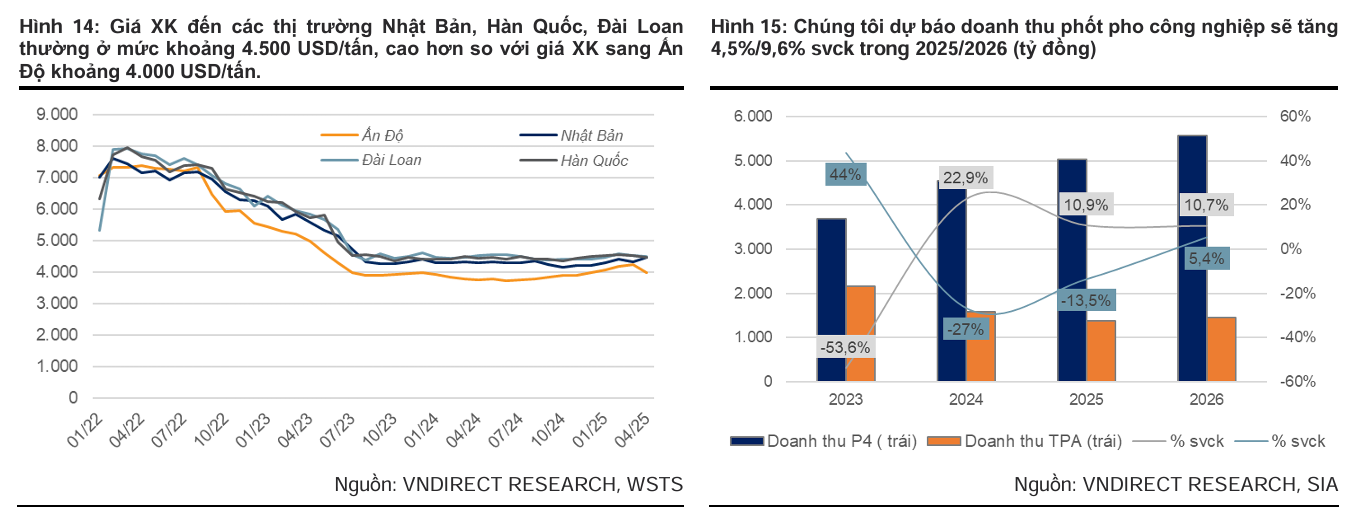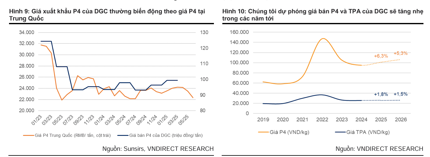 Giá phốt pho vàng phục hồi, hỗ trợ tăng trưởng doanh thu: Giá phốt pho vàng (P4) đã phục hồi nhờ ngành nông nghiệp sôi động thúc đẩy sản lượng thuốc trừ sâu gia tăng tại Trung Quốc. Giá P4 tại Trung Quốc trong tháng 7 phục hồi 2.6% so với cùng kỳ và 1.7% so với tháng trước. VNDirect kỳ vọng xu hướng này sẽ tiếp tục giúp giá bán của DGC hưởng lợi và dự báo giá P4 sẽ tăng 6.3%/5.3% so với cùng kỳ trong năm 2025/2026. P4 duy trì là động lực chính đóng góp vào tăng trưởng doanh thu nhờ nhu cầu bán dẫn và nông nghiệp gia tăng.